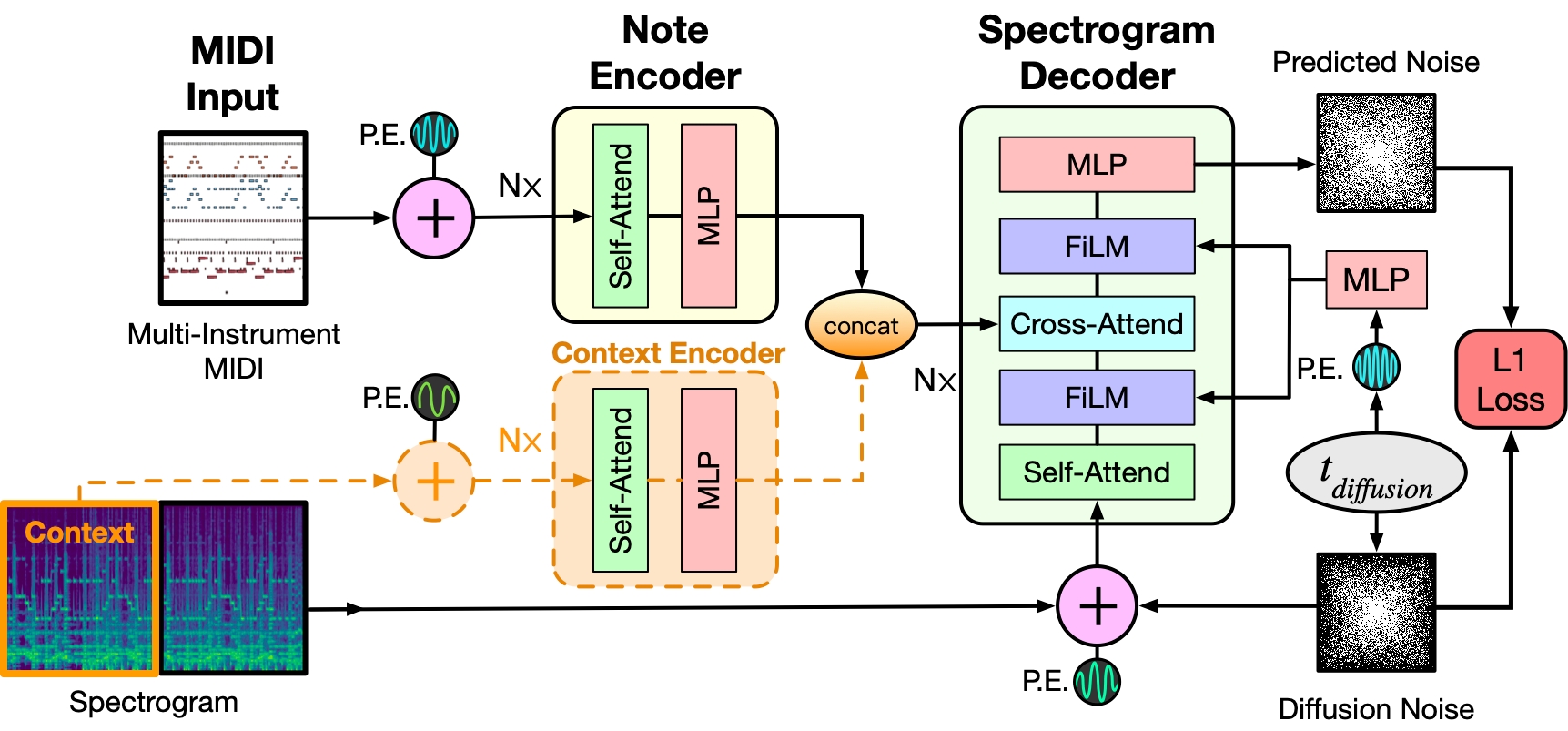 As depicted above the model takes as input a MIDI file and tokenizes it into a sequence of 5 second intervals. Each tokenized interval then together with positional encodings is passed through the Note Encoder and its representation is concatenated with the previous window’s generated spectrogram representation obtained via the Context Encoder. For the initial 5 second window this is set to zero. The resulting context is then used as conditioning to sample the denoised Spectrogram from the MIDI window and we concatenate this spectrogram to the final output as well as use it for the context of the next MIDI window. The process repeats till we have gone over all the MIDI inputs. Finally a MelGAN decoder converts the potentially long spectrogram to audio which is the final result of this pipeline.