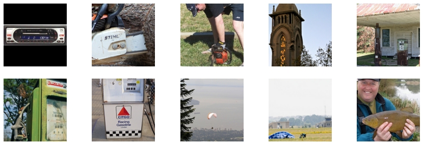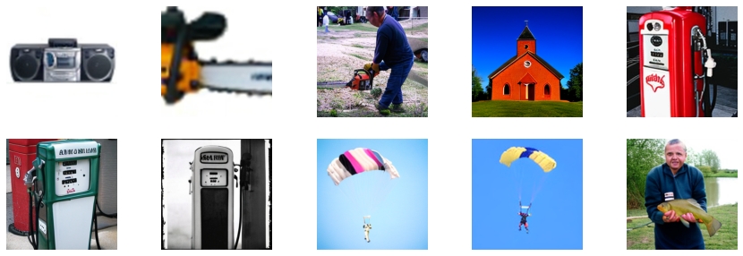 These are 10 images from the following Imagenet-1k classes: “cassette_player”, “chain_saw” (x2), “church”, “gas_pump” (x3), “parachute” (x2), and “tench”.