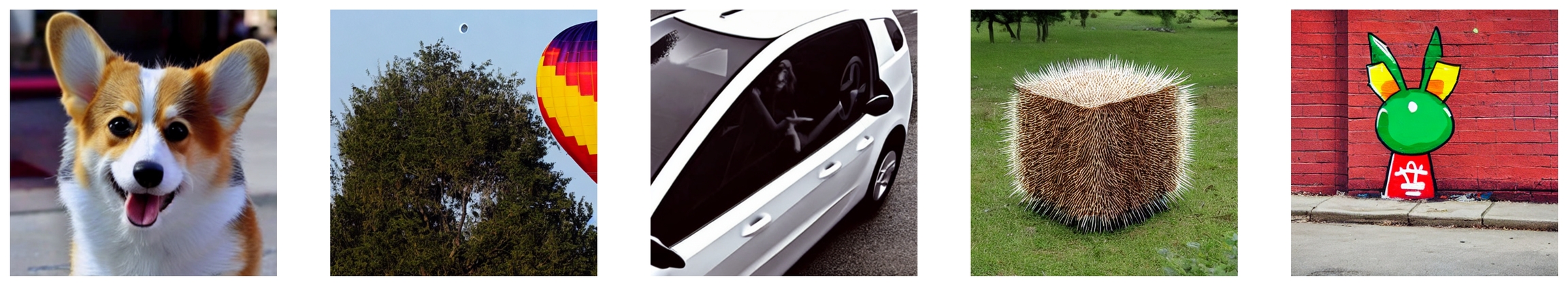 Below we show some prompts sampled across different challenges: Basic, Complex, Linguistic Structures, Imagination, and Writing & Symbols. Here we are using PartiPrompts as a dataset.