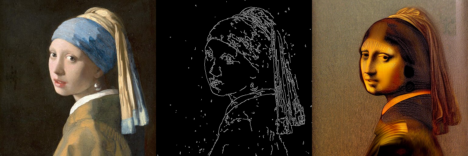 For inpainting, you need an initial image, a mask image, and a prompt describing what to replace the mask with. ControlNet models allow you to add another control image to condition a model with. Letβs condition the model with a canny image, a white outline of an image on a black background. This way, the ControlNet can use the canny image as a control to guide the model to generate an image with the same outline.