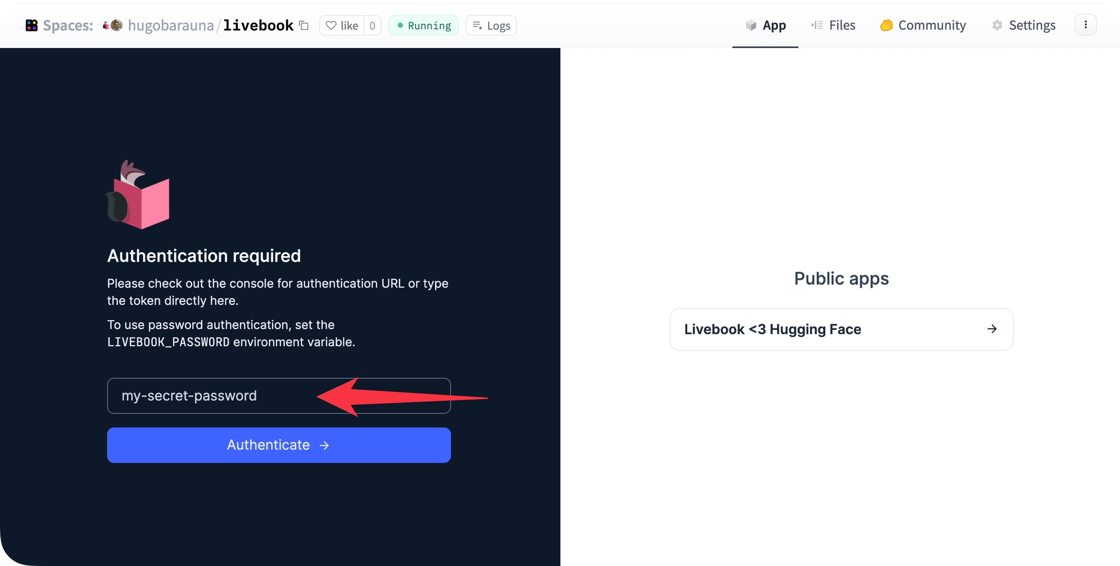 Once the app build is finished, go to the “App” tab in your Space and log in to your Livebook using the password you previously set:
