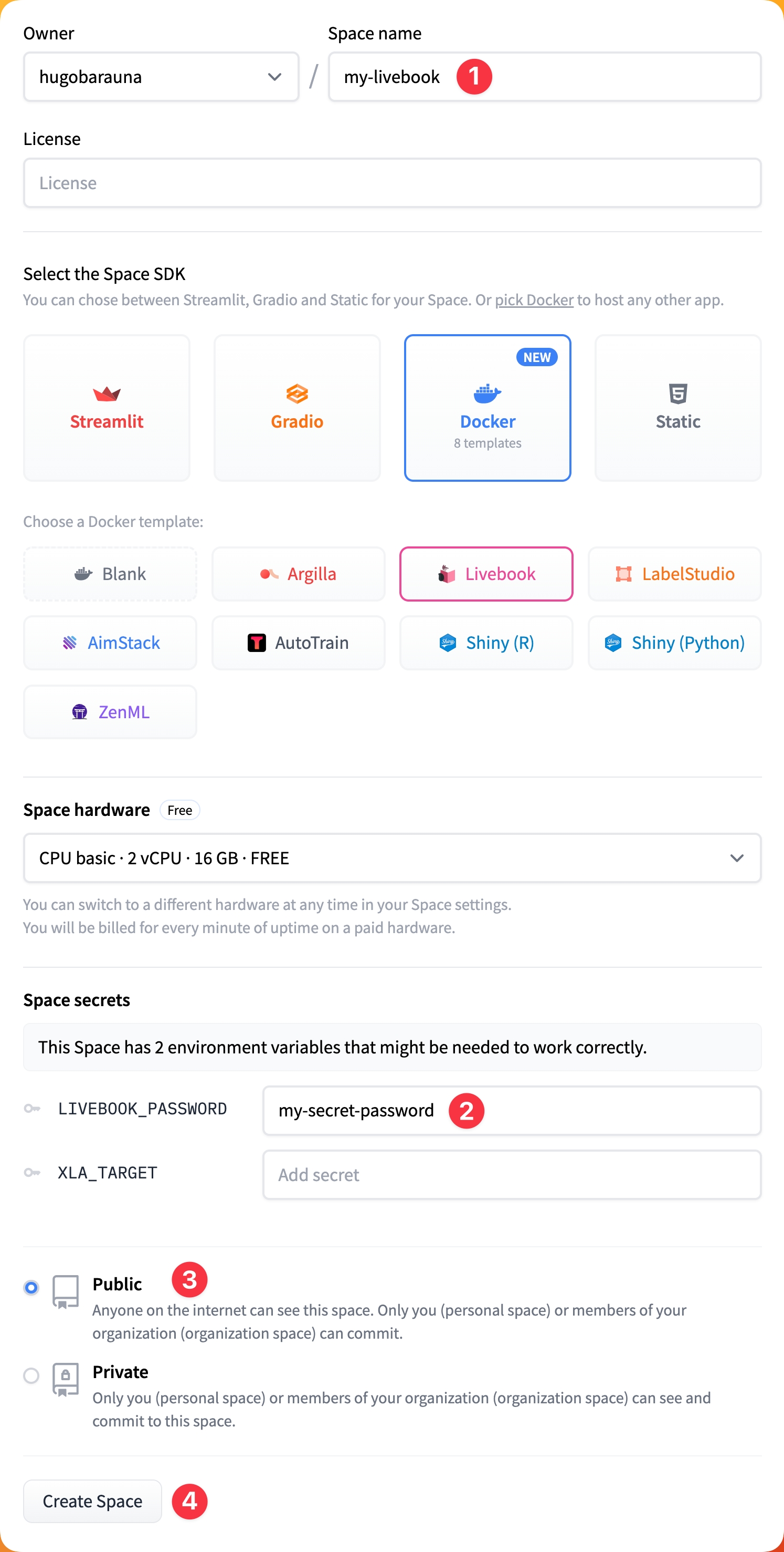 You can get Livebook up and running in a Space with just a few clicks. Click the button below to start creating a new Space using Livebook’s Docker template: