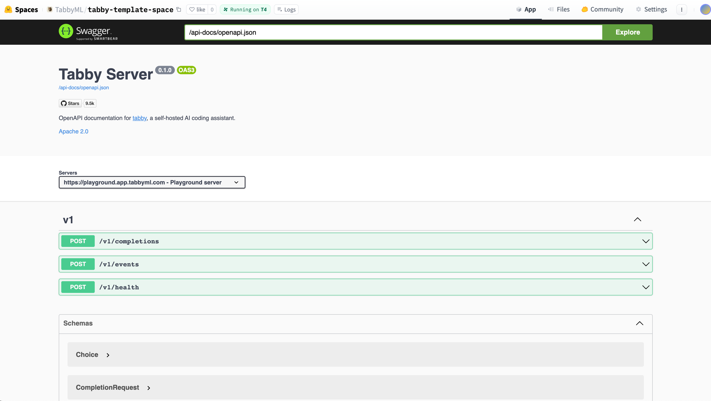 You’ll see the Building status. Once it becomes Running, your Space is ready to go. If you don’t see the Tabby Swagger UI, try refreshing the page.