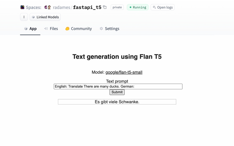 CMD ["uvicorn", "main:app", "--host", "0.0.0.0", "--port", "7860"]Success! Your app should be working now! Check out DockerTemplates/fastapi_t5 to see the final result.