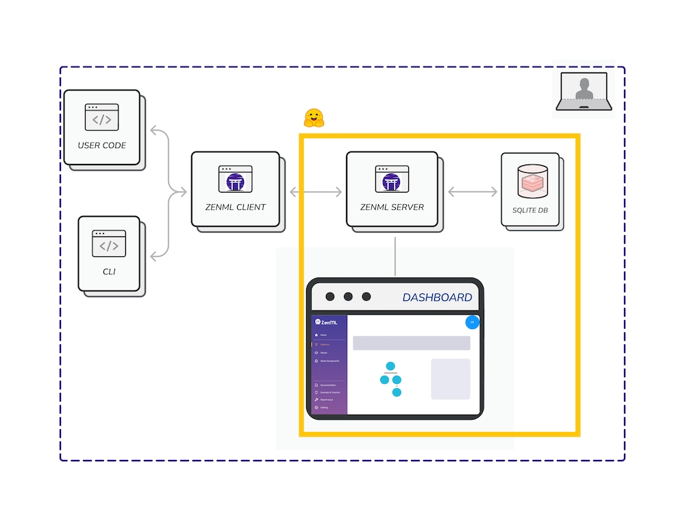 In the sections that follow, you’ll learn to deploy your own instance of ZenML and use it to view and manage your machine learning pipelines right from the Hub. ZenML on Huggingface Spaces is a self-contained application completely hosted on the Hub using Docker. The diagram below illustrates the complete process.