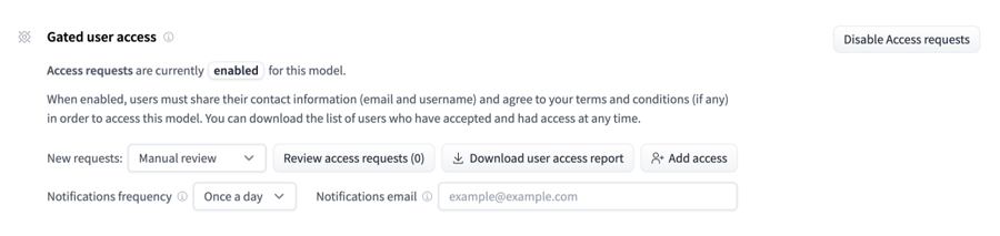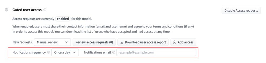 You can customize the way you receive those notifications from the gated model’s settings page. You can choose whether to receive notifications for new pending access requests in bulk once a day or in real-time. You can also set a custom email to send those notifications to.