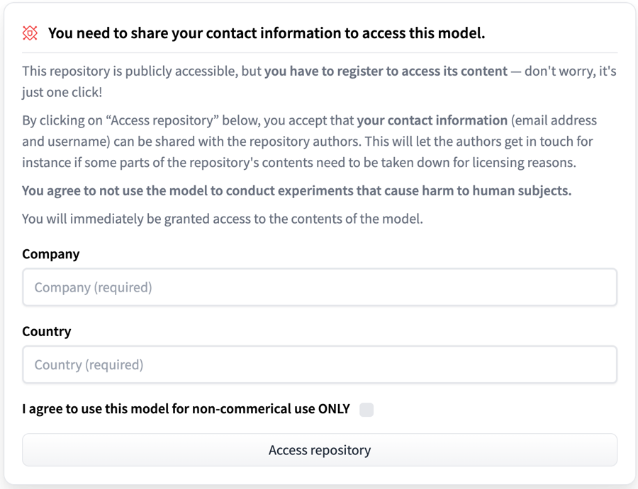 In some cases, you might also want to modify the text in the heading of the gate as well as the text in the button. For those use cases you can modify extra_gated_heading and extra_gated_button_content.