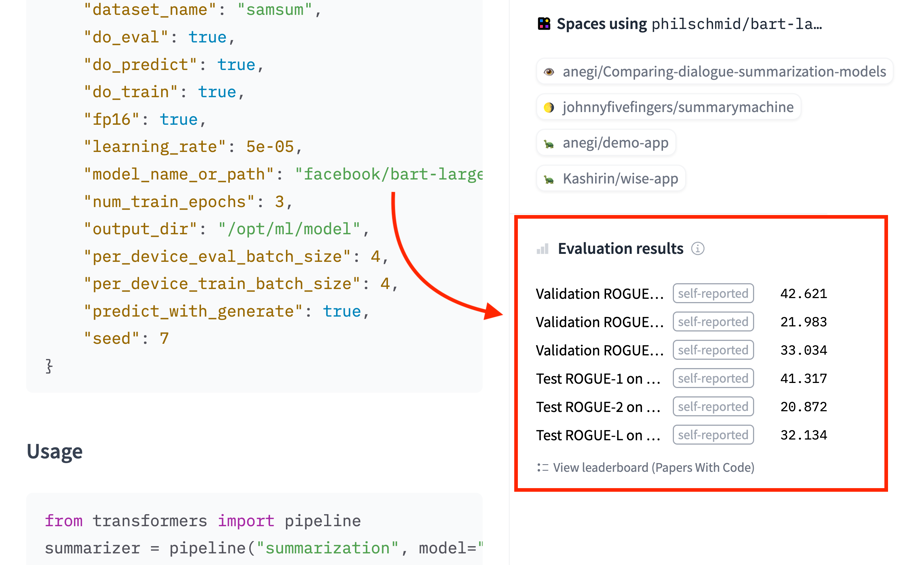 You can even specify your modelโs eval results in a structured way, which will allow the Hub to parse, display, and even link them to Papers With Code leaderboards. See how to format this data in the metadata spec.