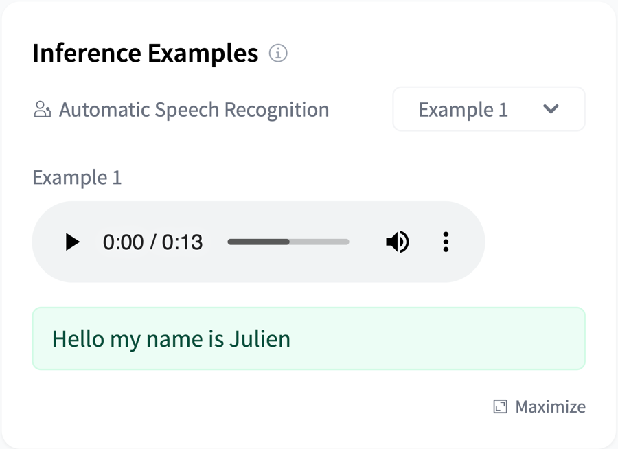 Moreover, you can specify non-text example inputs in the model card metadata. Refer here for a complete list of sample input formats for all widget types. For vision & audio widget types, provide example inputs with src rather than text.