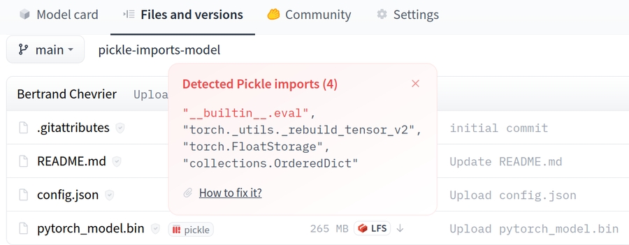 There are dangerous arbitrary code execution attacks that can be perpetrated when you load a pickle file. We suggest loading models from users and organizations you trust, relying on signed commits, and/or loading models from TF or Jax formats with the from_tf=True auto-conversion mechanism. We also alleviate this issue by displaying/βvettingβ the list of imports in any pickled file, directly on the Hub. Finally, we are experimenting with a new, simple serialization format for weights called safetensors.