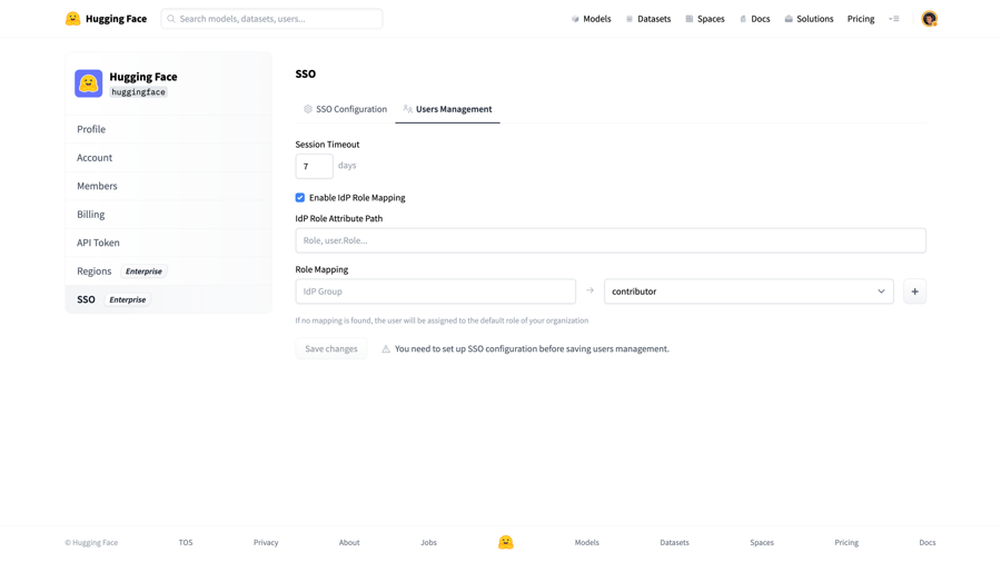The Hugging Face Hub gives you the ability to implement mandatory Single Sign-On (SSO) for your organization.