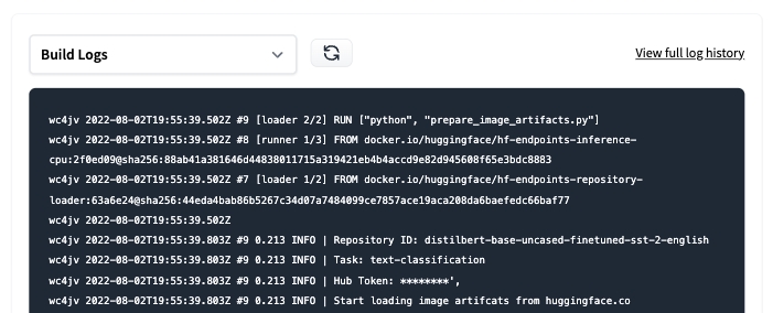 Note: If your Endpoint creation is in the “Failed” state, you can check the Build Logs to see what the reason was, e.g. wrong version of a dependency, etc.