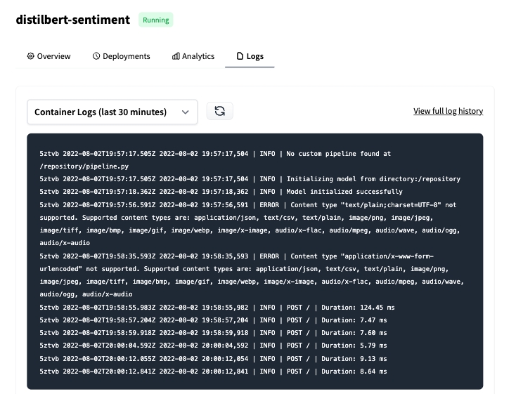 BOINC AI Endpoints provides access to the logs of your Endpoints through the UI in the “Logs” tab of your Endpoint.
