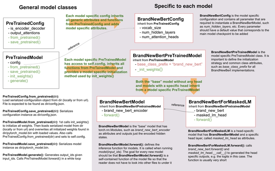 As you can see, we do make use of inheritance in 🌎 Transformers, but we keep the level of abstraction to an absolute minimum. There are never more than two levels of abstraction for any model in the library. BrandNewBertModel inherits from BrandNewBertPreTrainedModel which in turn inherits from PreTrainedModel and that’s it. As a general rule, we want to make sure that a new model only depends on PreTrainedModel. The important functionalities that are automatically provided to every new model are from_pretrained() and save_pretrained(), which are used for serialization and deserialization. All of the other important functionalities, such as BrandNewBertModel.forward should be completely defined in the new modeling_brand_new_bert.py script. Next, we want to make sure that a model with a specific head layer, such as BrandNewBertForMaskedLM does not inherit from BrandNewBertModel, but rather uses BrandNewBertModel as a component that can be called in its forward pass to keep the level of abstraction low. Every new model requires a configuration class, called BrandNewBertConfig. This configuration is always stored as an attribute in PreTrainedModel, and thus can be accessed via the config attribute for all classes inheriting from BrandNewBertPreTrainedModel: