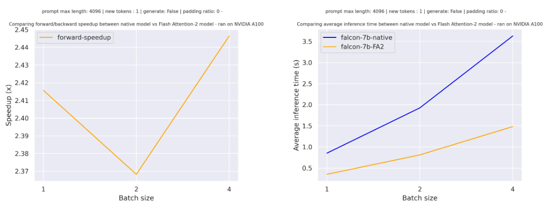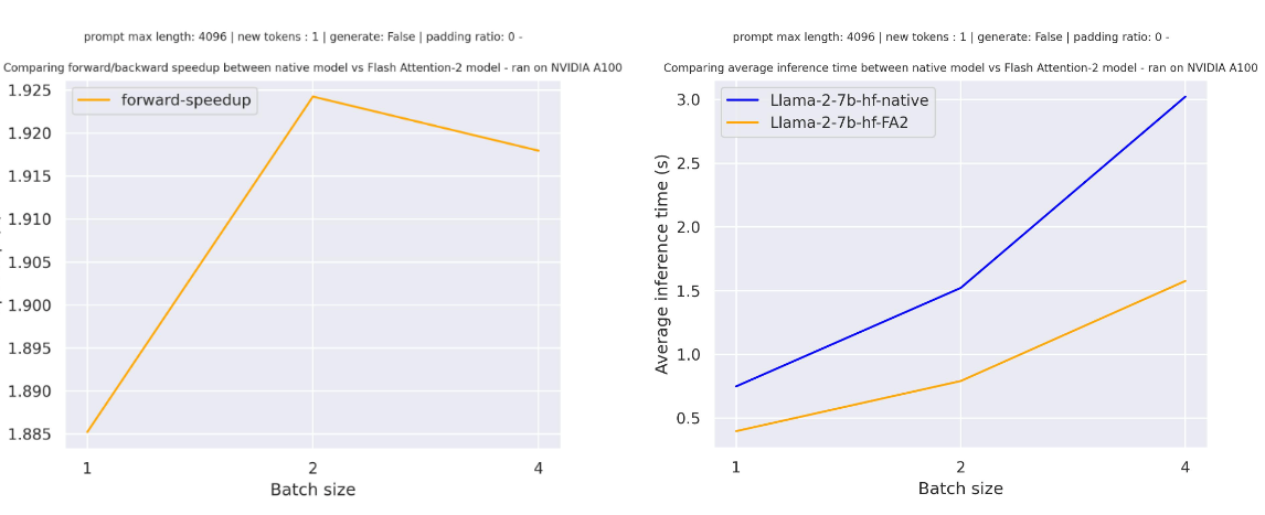 For sequences with padding tokens (training with padding tokens or generating with padding tokens), we need to unpad / pad the input sequences to compute correctly the attention scores. For relatively small sequence length, on pure forward pass, this creates an overhead leading to a small speedup (below 30% of the input has been filled with padding tokens).