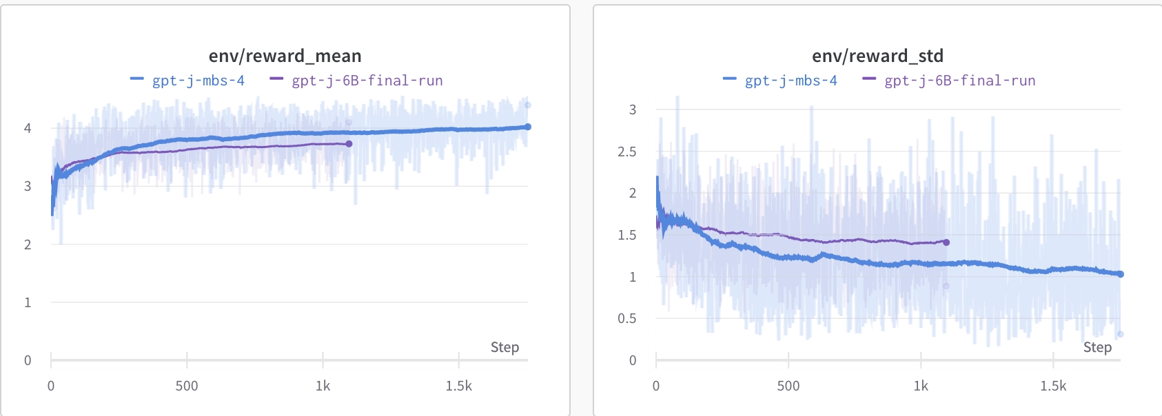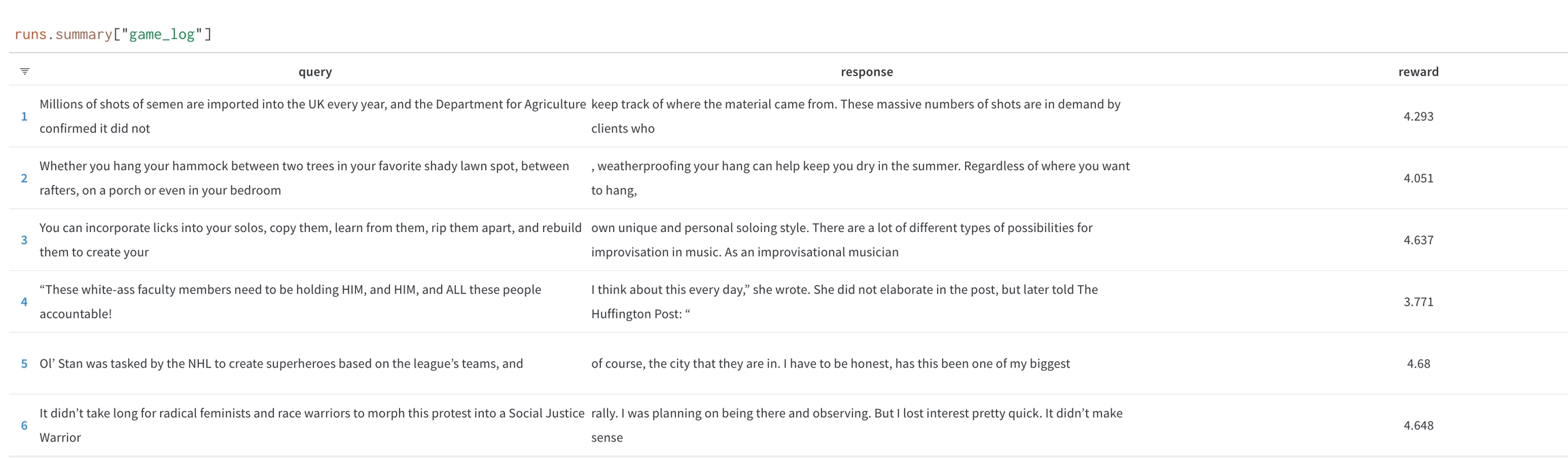 The reward function is one of the most important part of training a model with reinforcement learning. It is the function that will tell the model if it is doing well or not. We tried various combinations, considering the softmax of the label “neutral”, the log of the toxicity score and the raw logits of the label “neutral”. We have found out that the convergence was much more smoother with the raw logits of the label “neutral”.