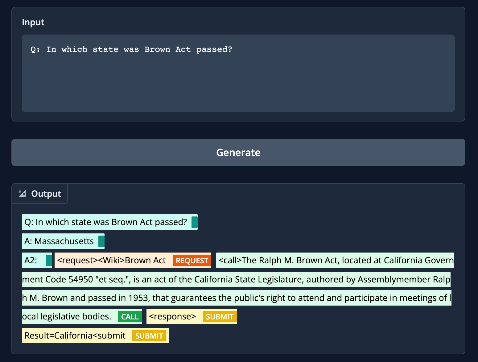 ToolFormer’s wiki tool returns “The Ralph M. Brown Act is an act of the California State Legislature that guarantees the public’s right to attend and participate in meetings of local legislative bodies.” which is more succinct.