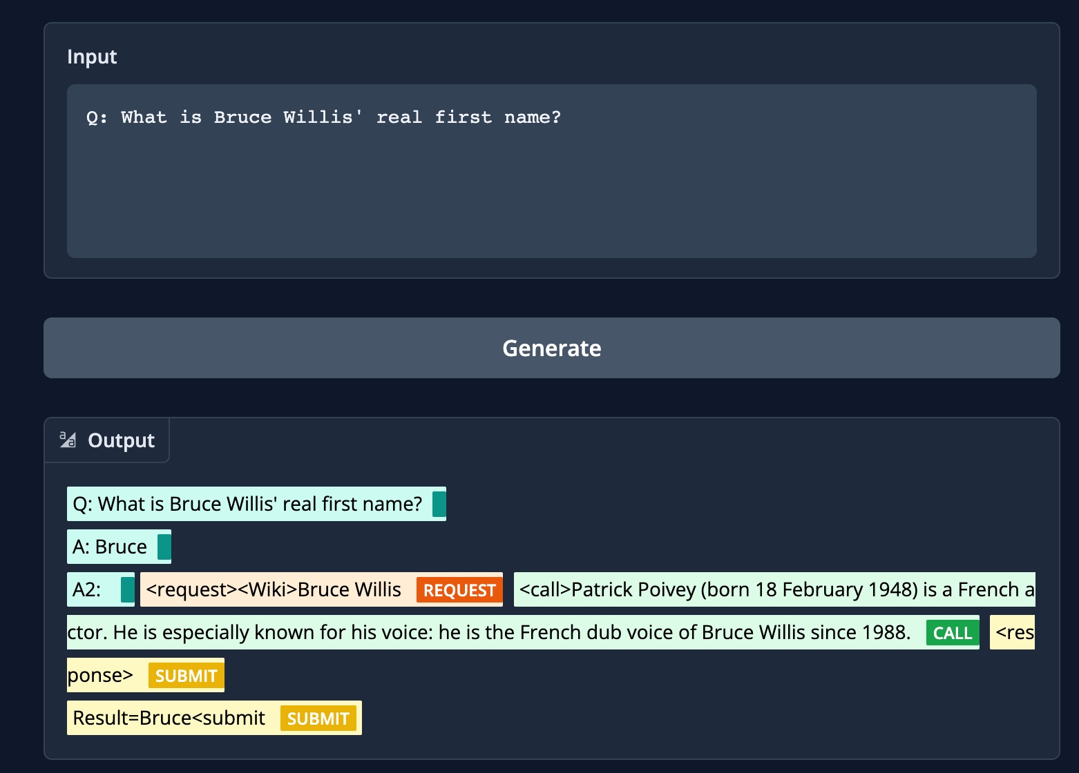 notice this is a simplified evaluation criteria. In ToolFormer, the authors checks if the first 20 words of the response contain the correct answer.